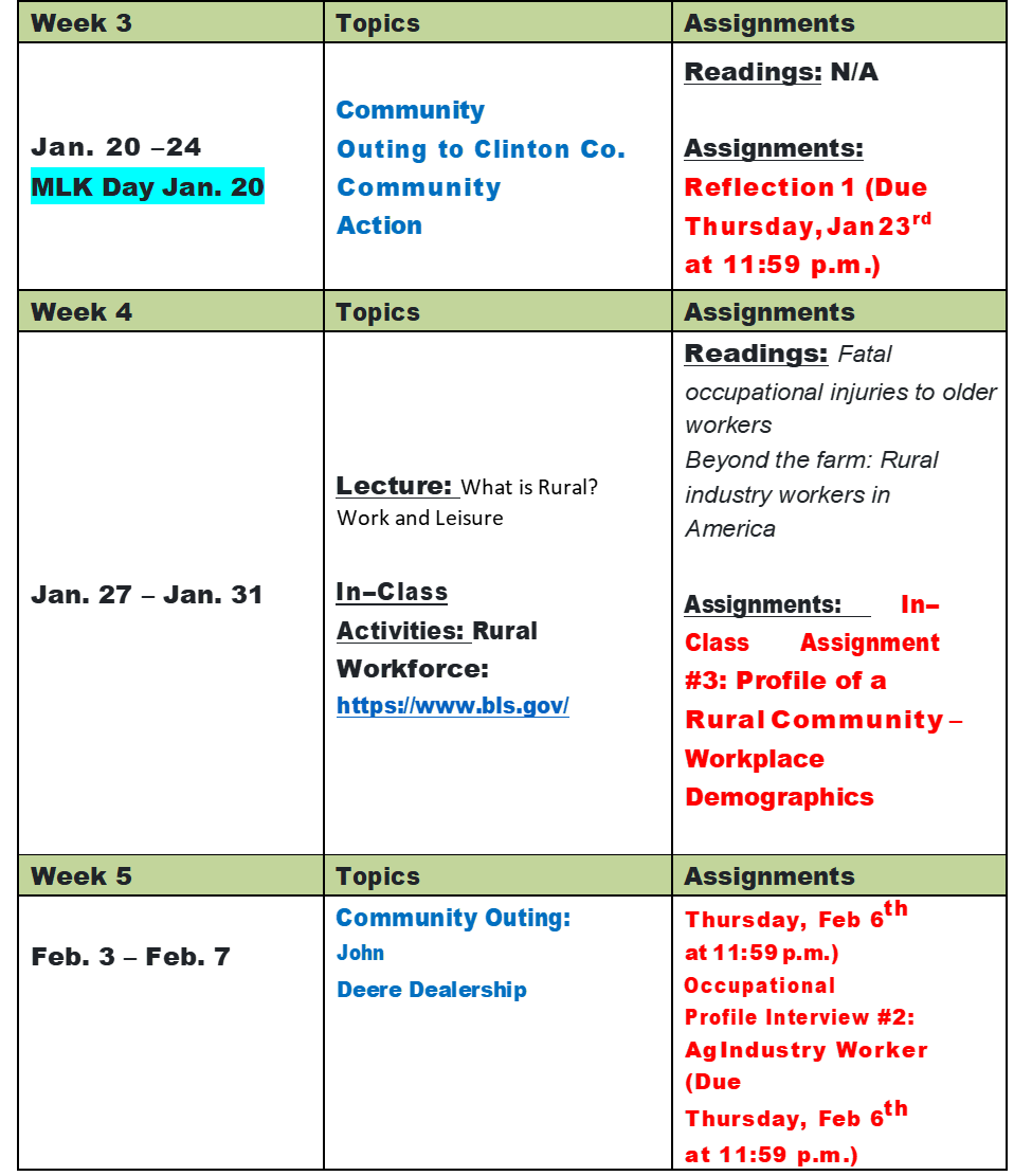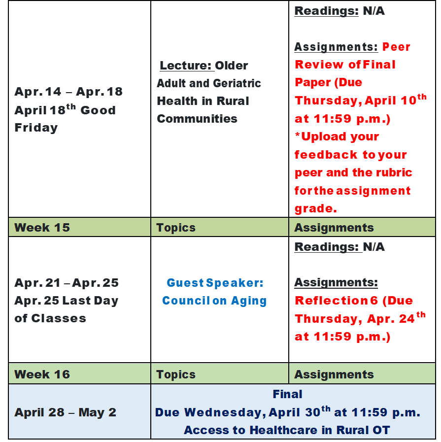This course is designed to emphasize the knowledge and skills necessary for practice in rural contexts. Students will examine issues relating to social determinants of health, as well as demographics, socioeconomics, politics, education, work, values, and lifestyle factors among rural populations. Students will explore social systems and community resources to mitigate health risks for persons, groups, and populations. Occupation-based programming and the delivery of occupational therapy services for rural populations will be discussed.